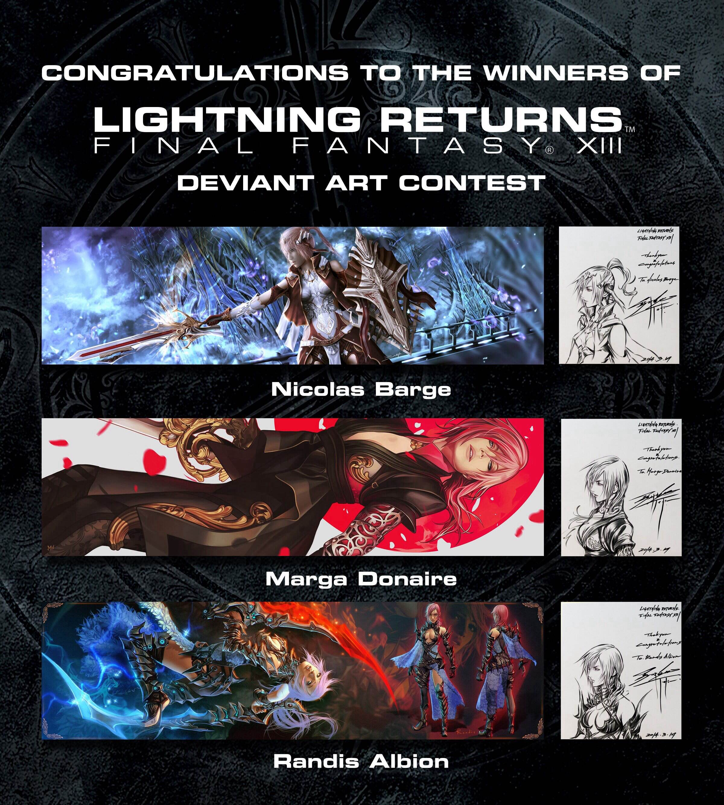 Quite some time ago Square Enix launched a DeviantArt contest on designing a garb for Lightning in Lightning Returns: Final Fantasy XIII. Three winners were personally chosen by Tetsuya Nomura himself, and today Square Enix revealed his very own sketches of the winners’ designs! What an honor! View them all close-up below.